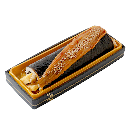 玉子や椎茸煮、胡瓜、高菜を入れた恵方巻です。具にもトッピングにも穴子を使用。