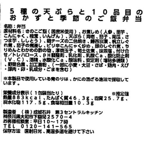 5種の天ぷらと10品目のおかずと季節のご飯弁当_【B-1】