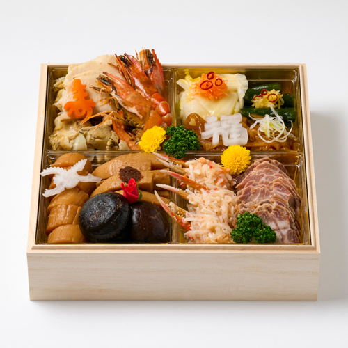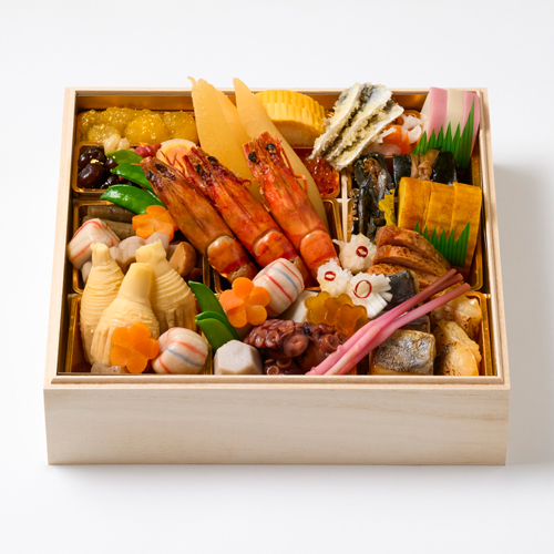 和栗の栗きんとん 金箔添え、黒豆、千代呂木、サーモン砧巻、錦玉子、いくら、生酢、ままかりばら子和え、かまぼこ紅白、鰊昆布巻、牛蒡、蓮根、松茸、数の子、大海老旨煮、田作り、伊達巻、合鴨ロース焼、筍、蒟蒻、海老芋、蛸桜煮、鰆西京焼、甘鯛雲丹焼、梅人参、菊花かぶ、絹さや、手毬麩、のし梅、はじかみ