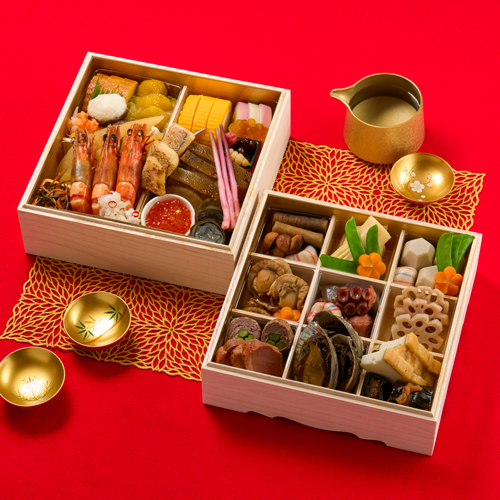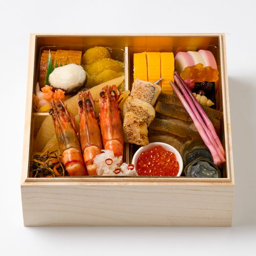 伊達巻、和栗の栗きんとん 金箔添え、サーモン生酢、裏白椎茸、錦玉子、かまぼこ紅白、田作り、黒豆、千代呂木、数の子、大海老旨煮、自家製松前漬け、甘鯛雲丹焼、寒鰤幽庵焼、いくら、鮃昆布〆、菊花かぶ、のし梅、はじかみ