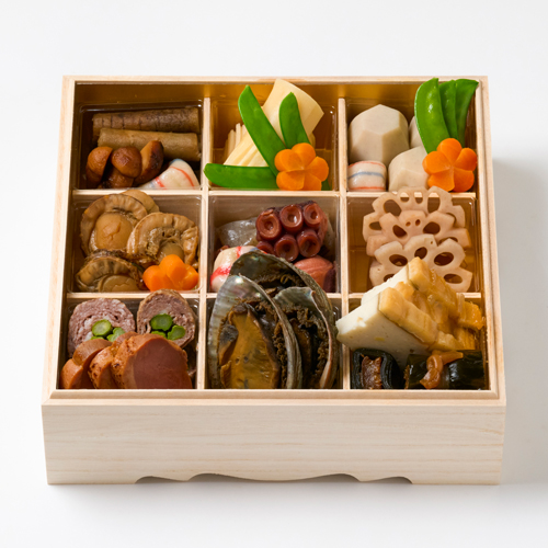 牛蒡、松茸、筍、海老芋、帆立しぐれ煮、蛸桜煮、蒟蒻、蓮根、黒毛和牛アスパラ巻、合鴨ロース焼、鮑の旨煮、鰊昆布巻、穴子しんじょう、梅人参、絹さや、手毬麩