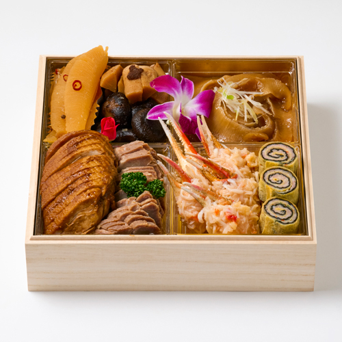 数の子の紹興酒漬け、竹の子と海老卵の炒め煮、椎茸の煮込み、さしみ湯葉の醤油煮、フカヒレの姿煮込み、国産豚肩ロースの焼豚、国産合鴨の甘味噌香味煮、蟹爪のタラバ蟹付け蒸し、国産豚肉と海老すり身の玉子焼き